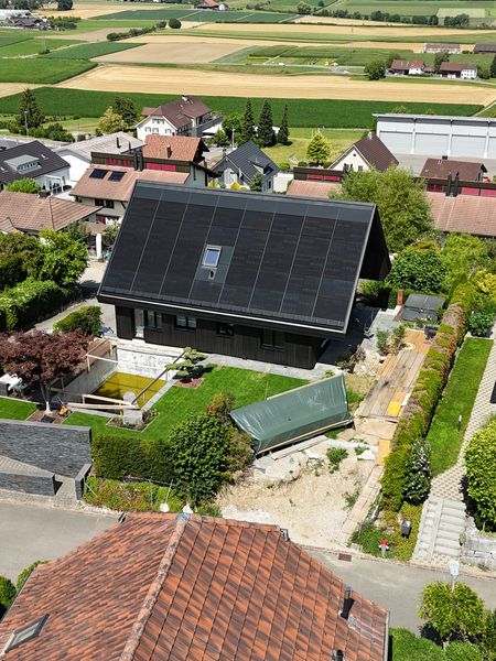 Das Einfamilienhaus in Büttikon wird im Zuge einer umfassenden energetischen Sanierung modernisiert. Ein zentrales Element dieser Massnahmen ist die Integration einer bauwerkintegrierten Photovoltaikanlage (BIPV) in die Gebäudehülle. Die Solarmodule sind funktional und gestalterisch in das Dachsystem eingebunden und übernehmen gleichzeitig die Funktion der wasserführenden Schicht. Dadurch entsteht eine ästhetisch hochwertige Lösung, die sowohl zur Energiegewinnung als auch zur architektonischen Aufwertung des Gebäudes beiträgt.